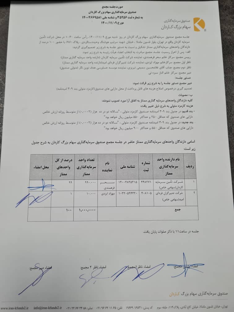 اسامی حاضرین در جلسه مجمع صندوق سرمایهگذاری سهام بزرگ کاردان (اساس نامه ای) مورخ 1400/11/09